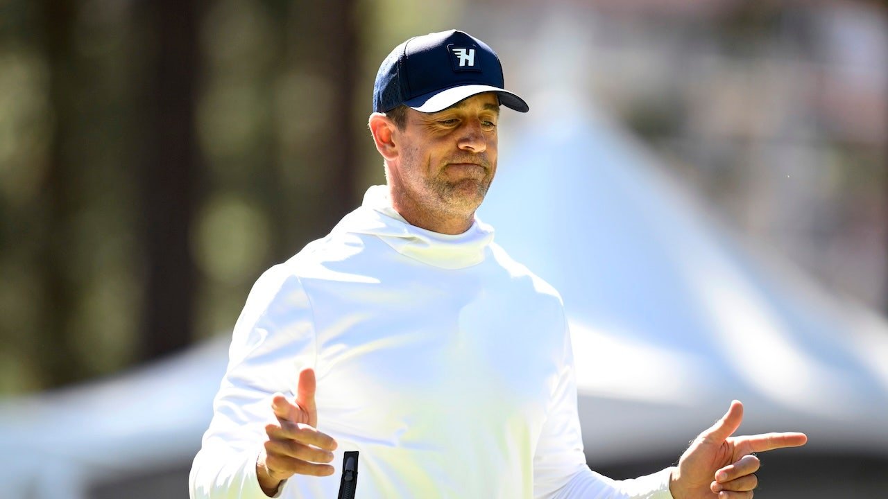 Aaron Rodgers gestures as he leaves the seventh tee box before the American Century Championship at Edgewood Tahoe Golf Course July 10, 2025, in Stateline, Nev.  (Eakin Howard/Getty Images)
