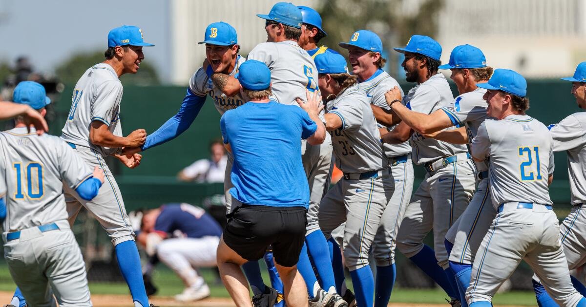 UCLA players celebrate after defeating Texas San Antonio to win the L.A. Super Regional on Sunday to advance to the Men’s College World Series.
