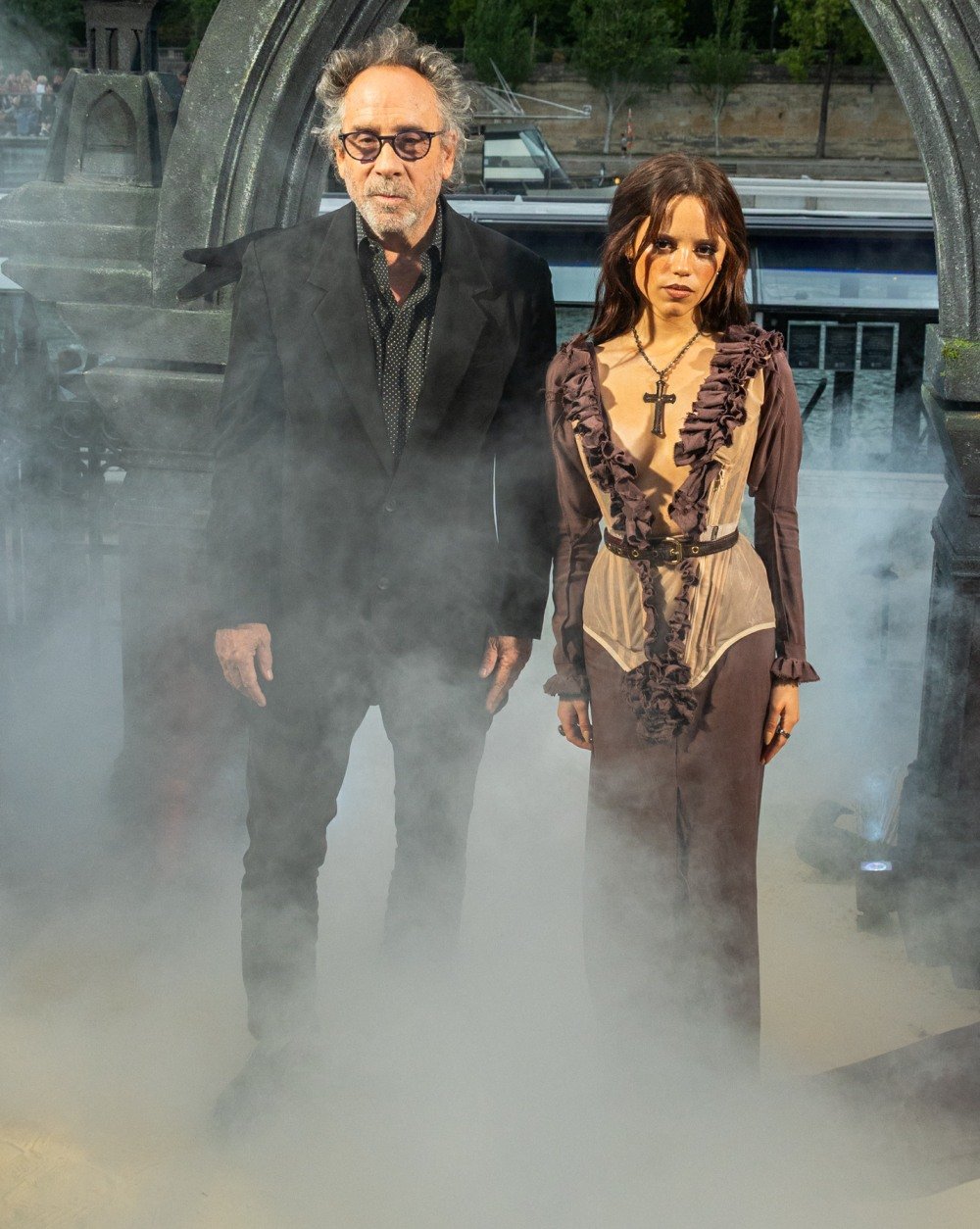 Jenna Ortega wore Andreas Kronthaler-for-Vivienne Westwood to another Wednesday Season 2 premiere event. This was supposed to be “Wednesday’s Beach Club,” hilarious. They overdid the smoke machine for the photocall. [RCFA]