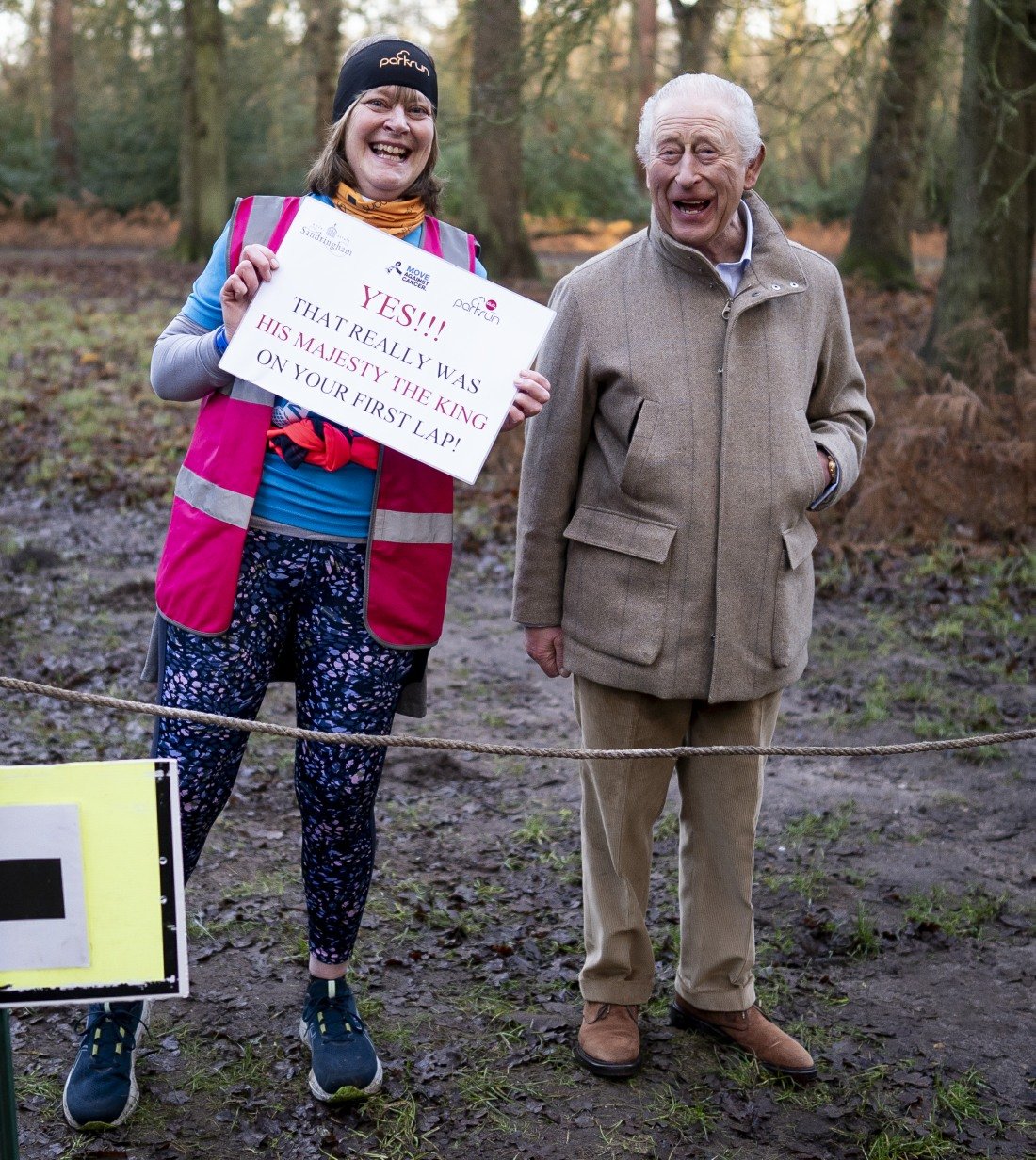 King Charles III with Sarah Byatt at a marshal point of the Sandringham parkrun in Sandringham, Norfolk.