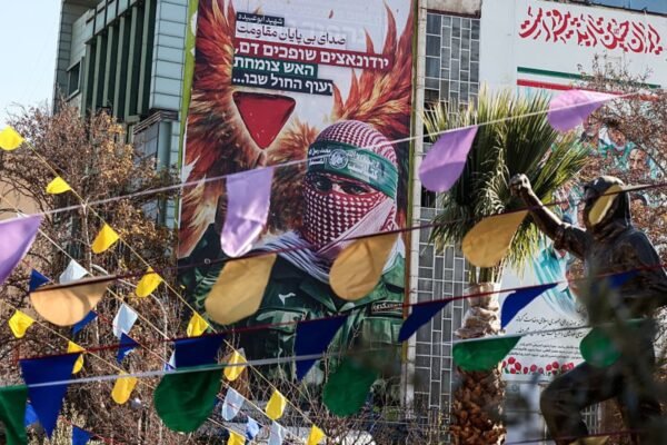 A large anti-Israeli banner portraying an image of a Palestinian fighter and the slogan in Persian and Hebrew, “Endless Voice of Resistance” is erected in Palestine Square in Tehran on December 31, 2025. Israel’s Mossad spy agency issued a direct call on December 31, 2025,urging Iranians to press on with protests, saying it was supporting…