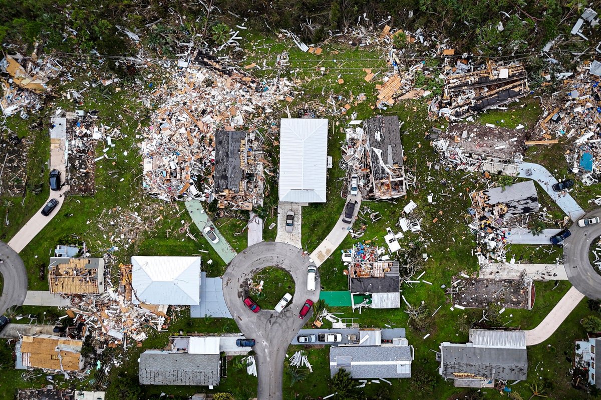 Aerial view of destroyed houses in Port St Lucie, Florida, after a tornado hit the area and caused severe damage as Hurricane Milton swept through Florida on October 11, 2024.