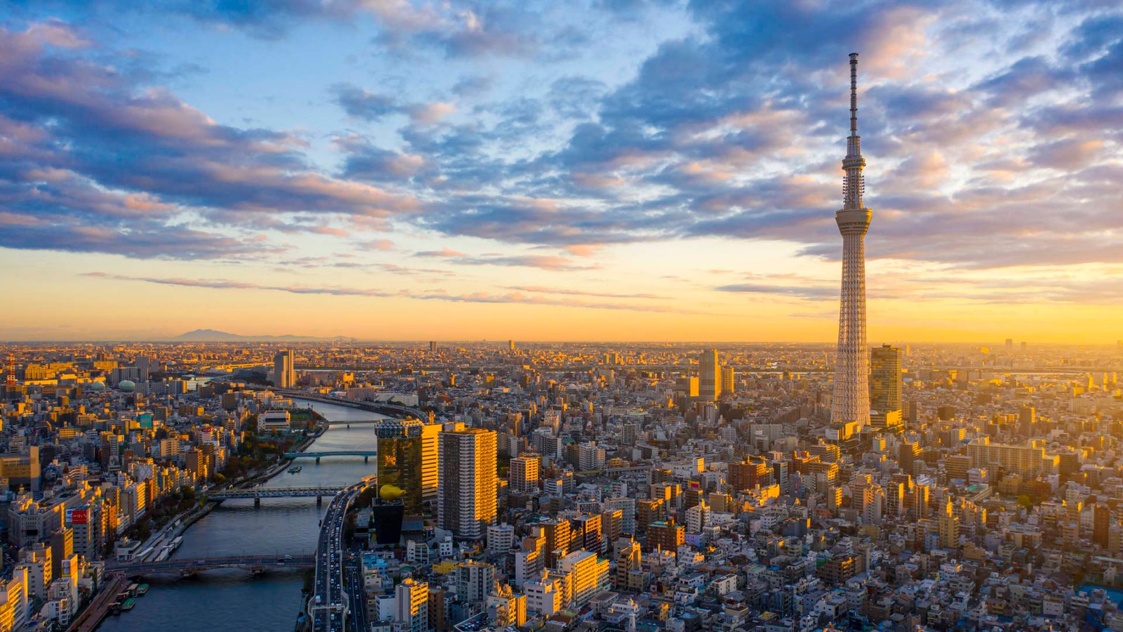 Aerial view by drone of Tokyo Cityscape with Tokyo Sky Tree visible in Tokyo city, Japan on sunrise.