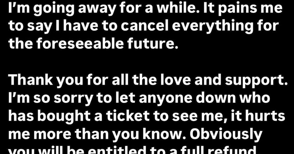 ”I’m going away for a while. It pains me to say I have to cancel everything for the foreseeable future,” she wrote in a statement.