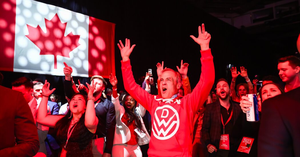 Prime Minister Mark Carney of Canada won a new term on Monday night, a remarkable turnaround for his Liberal Party, which surged in popularity as President Trump took an increasingly aggressive stance toward the country.