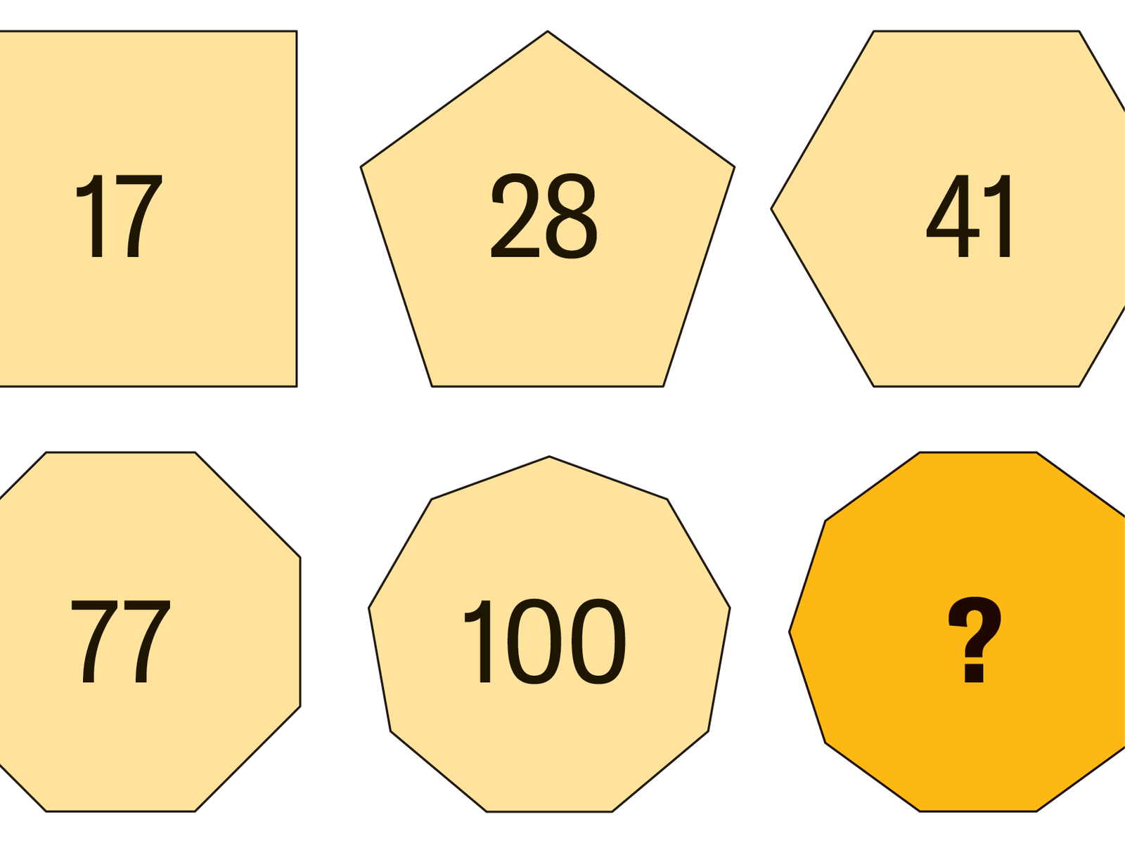 The number in each polygon with n sides is the sum of the first n prime numbers’ values.