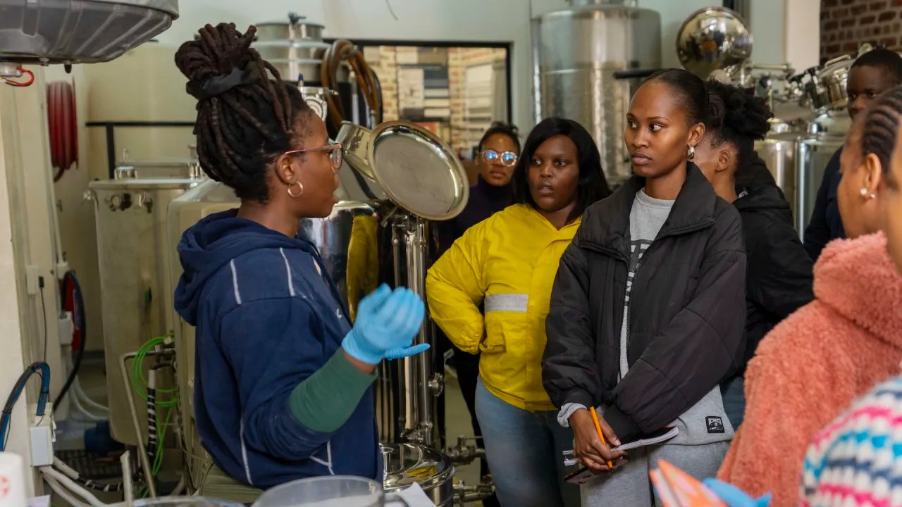 After pouring brown, gritty liquid from a huge silver tank into a flute-like container known as a refractometer, South African beer brewing master Apiwe Nxusani-Mawela gives an expert nod of approval and passes it around to her students, who yell their observations with glee.
