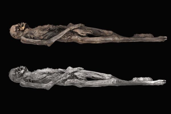 A 3D model of the tattooed mummy. The top image features textures derived from photographs that were captured using light visible to the human eye, while the bottom image’s textures were derived from photography in the near-infrared, which we cannot see M. Vavulin Elaborate tattoos featuring tigers, birds and a fantastical animal have been revealed…
