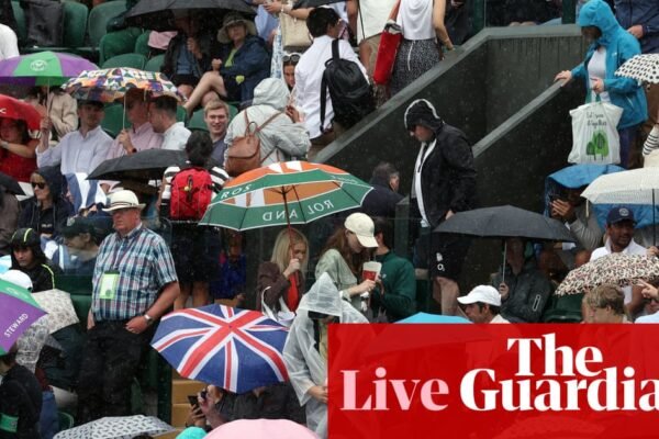 Key events Show key events only Please turn on JavaScript to use this feature The covers remain on the outside courts. Still no play until at least 1.30pm BST there. It might just be brightening up? Groundstaff deal with the deluge at Wimbledon. Photograph: Ezra Shaw/Getty Images Share Over on Centre Court at 1.30pm BST,…