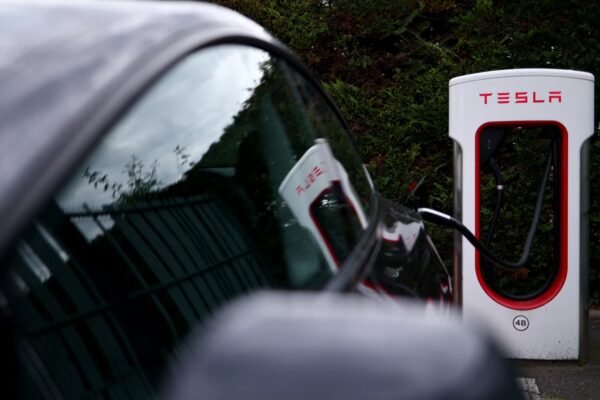 A photo shows an electric car connected to a Tesla charging station (Tesla Supercharger) in Chasse-sur-Rhone, central France, on June 6, 2025. Alex Martin | Afp | Getty Images Tesla new car sales in Europe fell for a fifth straight month in May, according to data from the European Automobile Manufacturers Association (ACEA), as customers…