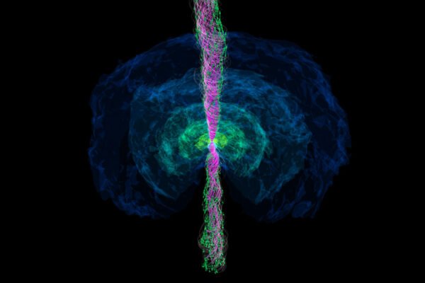 A computer simulation shows how two neutron stars of unequal mass merge, form a black hole and spit out a jet of high energy matter.