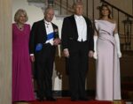 Fashion notes… Melania wore a structural, strapless Dior gown for the state dinner. When the two couples first walked out, Melania looked terrified for some reason, probably involving her husband’s diaper. “Queen” Camilla wore a custom gown by her dressmaker Fiona Clare. It’s AWFUL. I know Camilla isn’t great at formalwear, but she’s had much better state-dinner looks than this!! Remember her caped, navy Dior gown at the 2023 French state dinner at Versailles? A million times better than this. Camilla also avoided wearing a tiara for some reason, even though QEII wore various tiaras for previous White House state dinners. Camilla did wear some jewels though – a diamond-and-amethyst demi-parure. Eh. There are much better Royal Collection pieces.