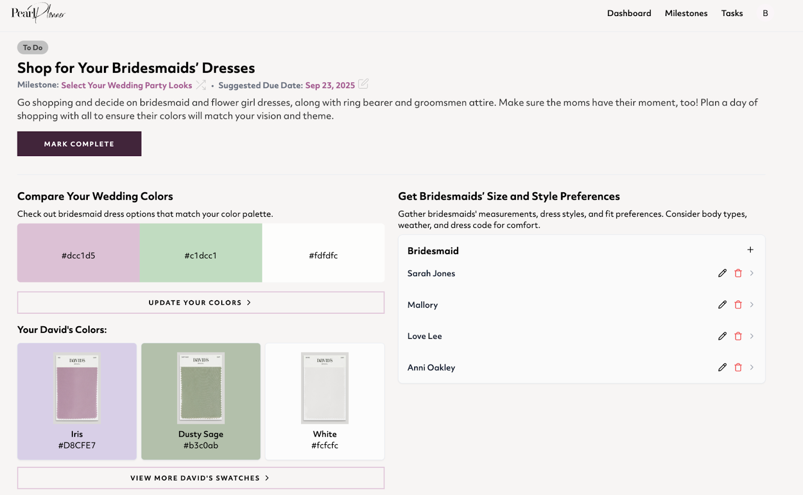 This profile informs every subsequent interaction, from content recommendations to task prioritization, all without requiring the bride to manually explain her vision repeatedly. Additionally, the system curates the bride’s aesthetic, which can sometimes be hard to communicate when it might be a mixture of trends and themes, using that information to create a personalized experience from the colors of her Pearl Planner dashboard to recommended bridal party colors and soon, wedding website design and invitation themes.