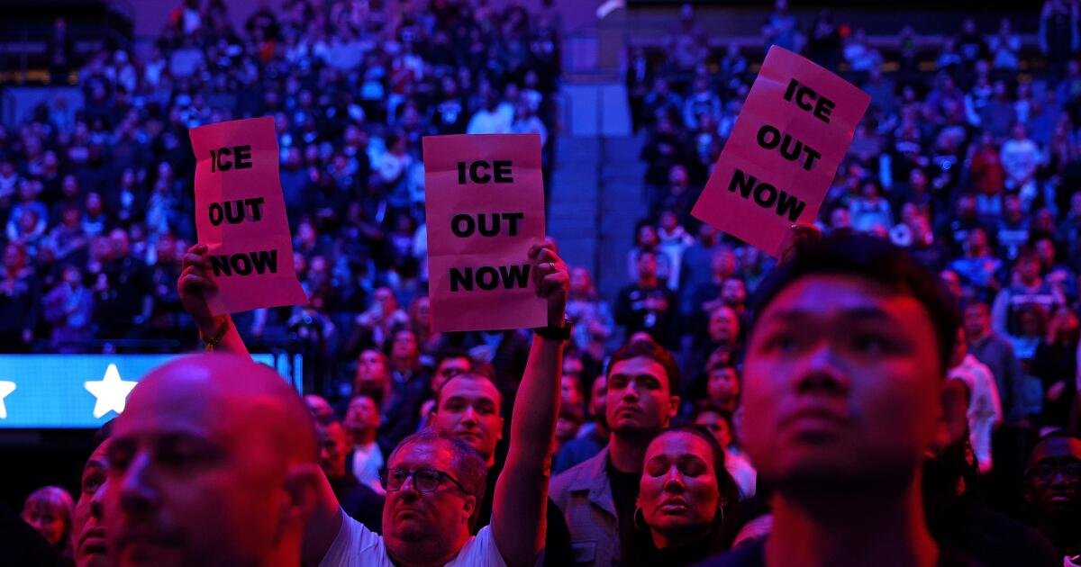 Some fans held signs reading “ICE Out Now,” while some members of a trampoline dunk team providing in-game entertainment wore shirts that echoed the sentiment.