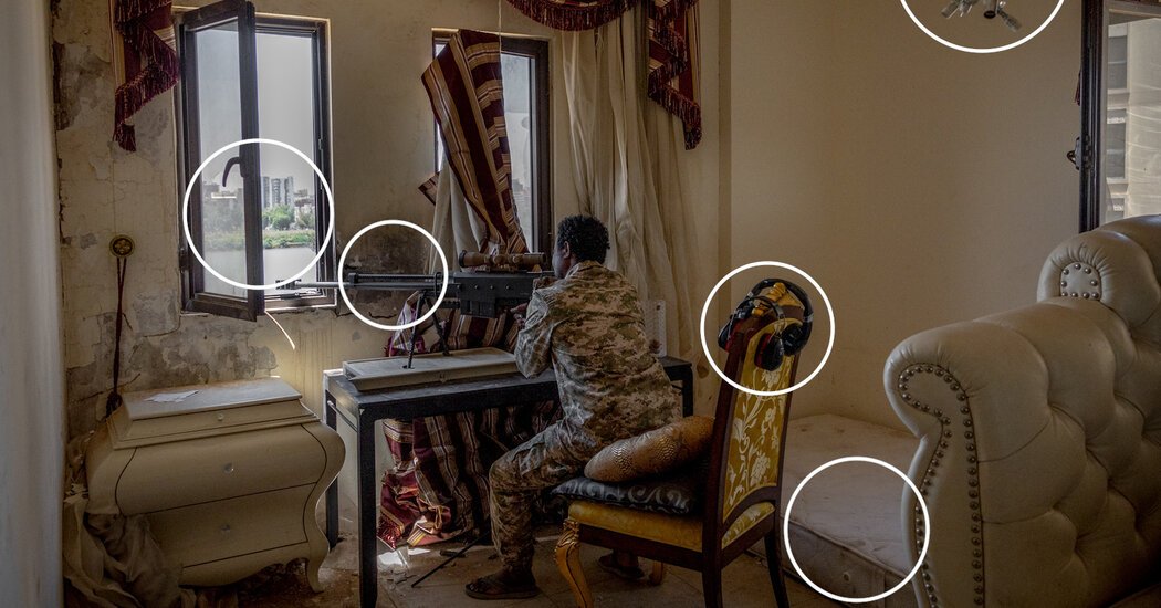 Exploring an image of Sgt. Maj. Ismail Hassan of the Sudanese Army at a sniper position in a luxury apartment block across the Blue Nile from Sudan’s presidential palace.