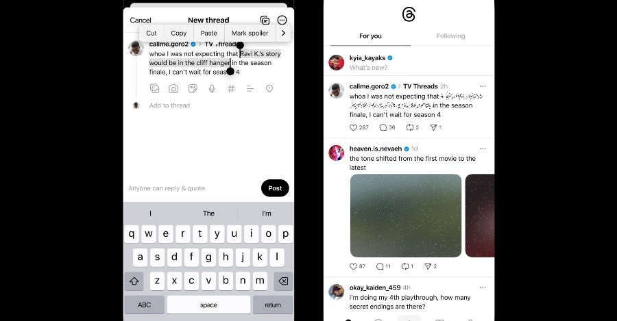 Threads is rolling out a test that will let you hide images or text that contain spoilers, according to a post from Meta CEO Mark Zuckerberg. With the test, you’ll be able to blur content by tapping an image or highlighting text and selecting the “mark spoiler” option.