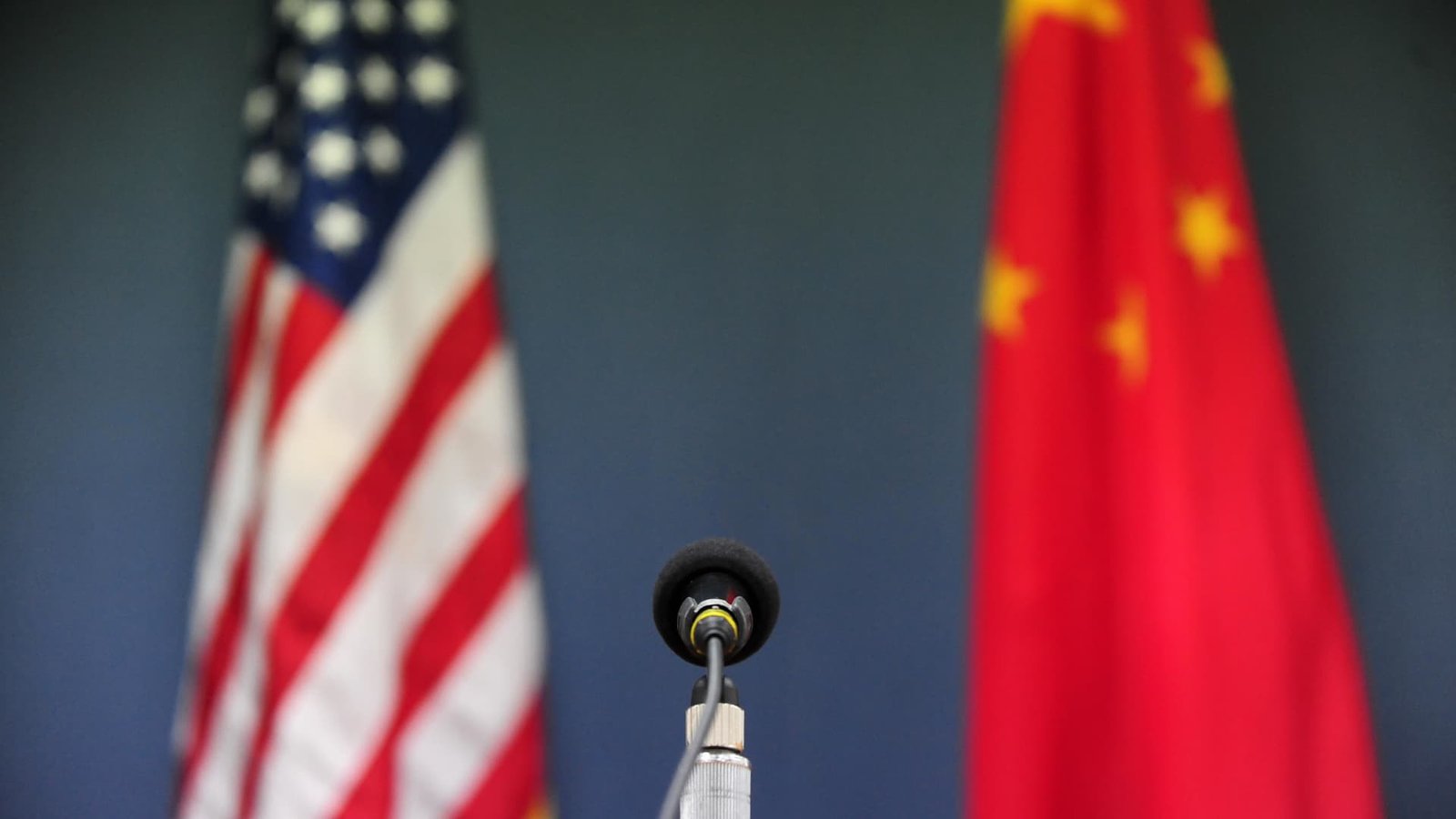 The U.S. and China flags stand behind a microphone at the U.S. Embassy in Beijing on April 9, 2009.
