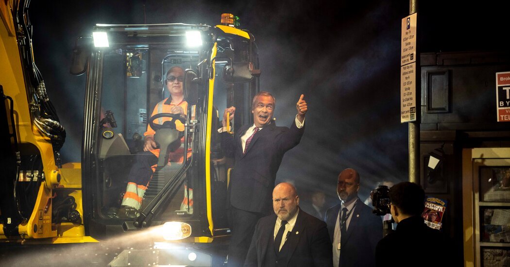 The pulsing beat of a dance track grew to a thunderous pitch and the crowd rose to its feet. Beams of light flashed across the cavernous arena in Birmingham, central England. Then, at last, Nigel Farage, the right-wing populist leader who claims he can fix a “broken Britain,” arrived onstage, hitching a ride on a backhoe.