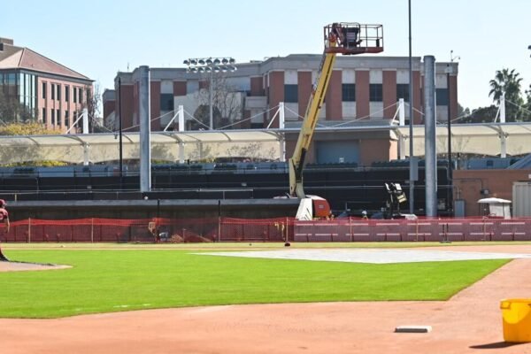 The first thing that catches your eye as you enter new Dedeaux Field — once you’ve navigated the ground floor of the parking structure, past the temporary batting cages in the construction zone beyond center field, down the path strewn with electric scooters, around “CONSTRUCTION ACCESS GATE #3” and onto the warning track of USC’s…
